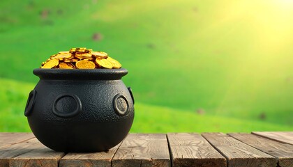 Black cauldron overflows with gold coins in a warm, dimly lit room, creating a magical atmosphere of wealth and fortune