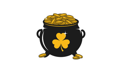 Black cauldron filled to the brim with shiny gold coins and decorated with a large golden shamrock for St. Patrick's Day celebrations.