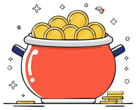 Red pot overflowing with gold coins and sparkling stars, symbolizing luck and wealth