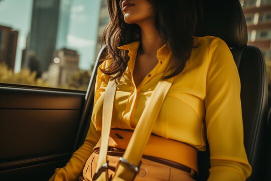 Close up view of woman driver ensuring safety by fastening seatbelt while driving car