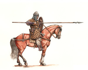 Medieval mounted knight. German (ottonic) heavy cavalry charging at the Battle of Lechfeld, 955.