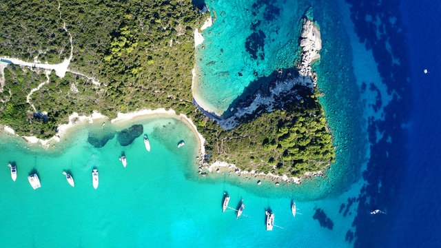 Aerial drone bird's eye view photo of sail boats docked in tropical caribbean paradise bay with white rock caves and turquoise clear sea