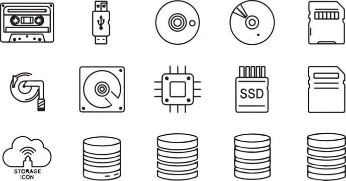 Assorted Digital Storage Media Icons | Collection of Data Storage Devices and Computer Memory in Outline Style for Web Design, Infographics, UI/UX and Technical Illustrations