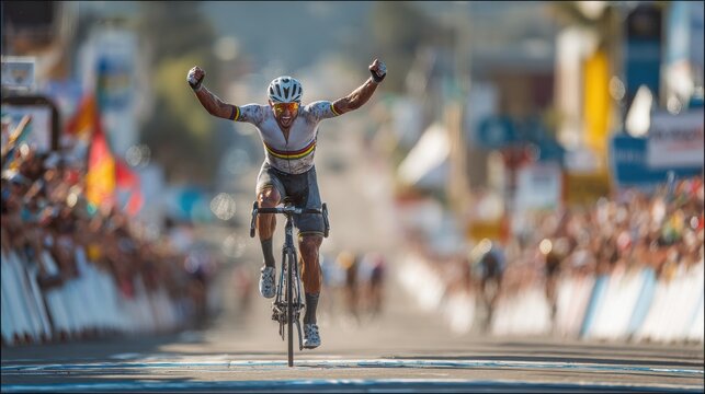 Cyclist triumphantly crossing finish line with cheering crowd in background during race, illustrating the idea of success and accomplishment in competitive cycling.