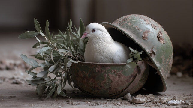A white dove of peace with an olive branch nests in a rusty military helmet. Conceptual image symbolizing hope and the end of war. Anti-war metaphor