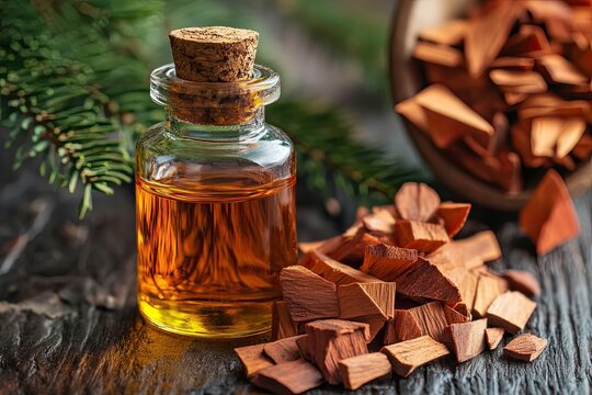 Cedarwood Essential Oil with Cedarwood Shavings and Pine Branches on Natural Wood Table