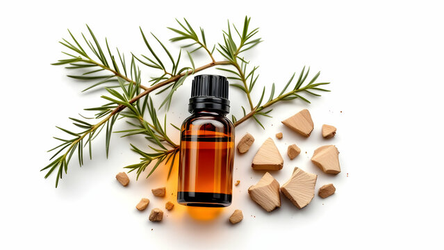 Close-up of a bottle of cedarwood oil. The oil is a natural remedy with many benefits for skin and hair.