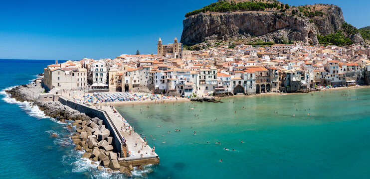 Aerial view of Cefalu, on the Tyrrhenian coast of Sicily, Italy