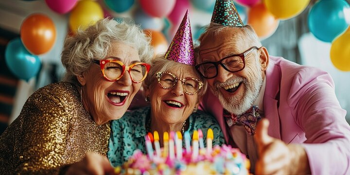 Birthday Celebration: elderly share a laugh and a moment of joy as they celebrate a birthday with a cake and balloons. Their genuine happiness radiates warmth and connection.