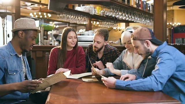 Company of young friends reading menu and choosing dishes for order in the bar, pub.