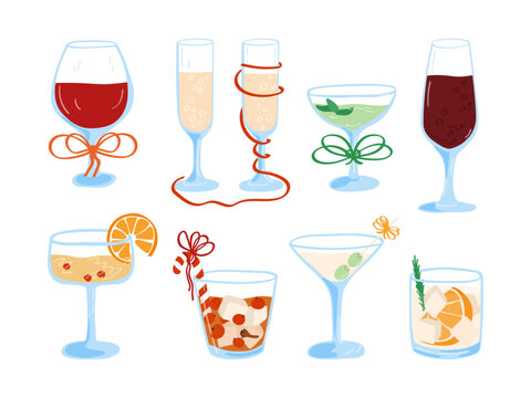 Christmas cocktails set. Alcoholic drinks in different glasses with ribbon and bows. Festive cocktail menu vector illustration.