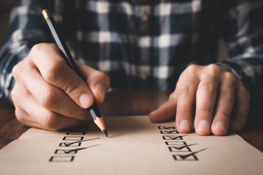 Action of safety officer or supervisor is taking note during safety audit in oil field operation, Close-up and selective focus at people's hand.