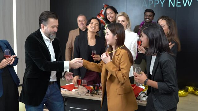 Business party and success celebration - Group of diverse business people colleagues or employees dance Applause clapping at event party. achievement