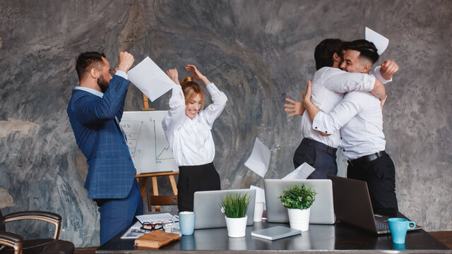Happy overjoyed business team celebrate corporate victory