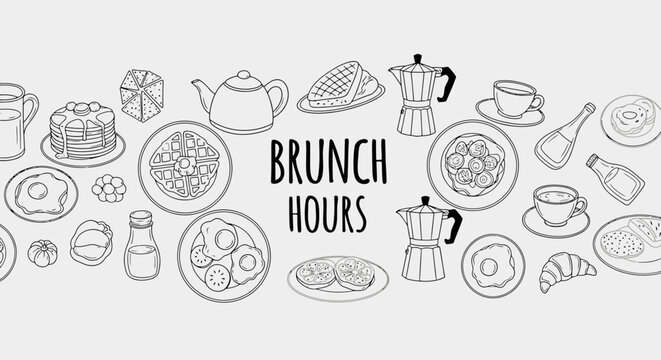 Delightful hand-drawn brunch icons celebrate morning meals, coffee, and sweet treats perfect for cafe menus and food blogs