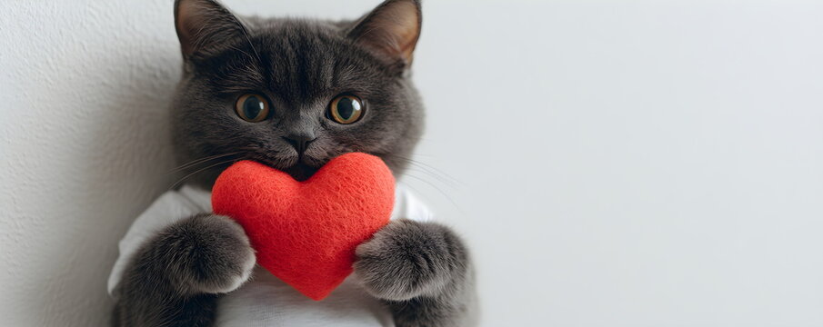 British gray cat in a white T-shirt holds a red fabric heart on a white background. Valentine's Day, for a greeting card or advertising banner with copy space. Romantic gift, celebrating February 14.