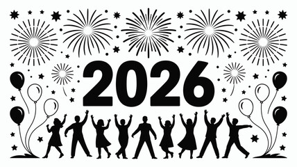 Celebrate exciting 2026 New Year with vibrant fireworks, balloons, and joyful people dancing