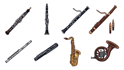 Collection of wind instruments with saxophones and trumpet in flat style