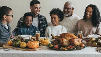 Multi-generational black family celebrates Thanksgiving with a roasted turkey. Happy people at festive dinner table for holiday meal footage.