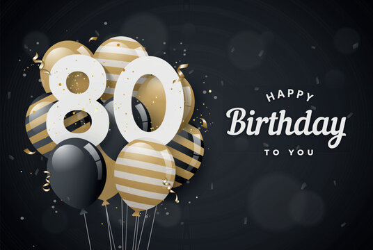 Happy 80th birthday balloons greeting card black background. 80 years anniversary. 80th celebrating with confetti. Vector stock