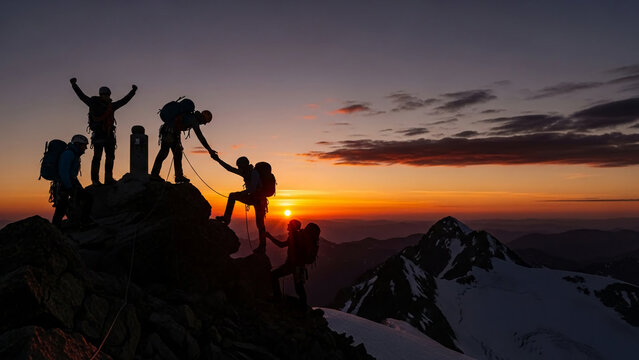 Team of climbers reaching mountain summit at sunrise celebrating success with teamwork and adventure inspiring outdoor activity concept
