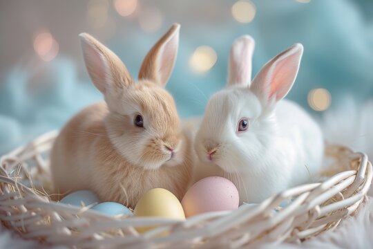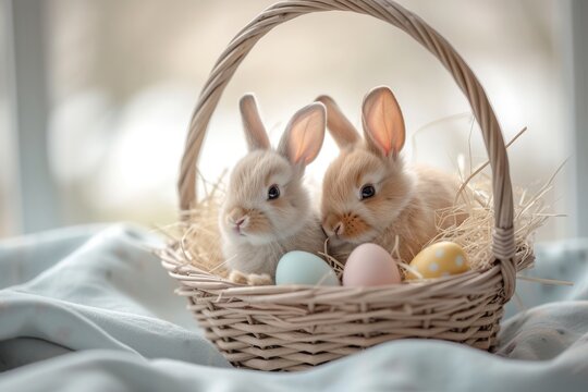 Happy Easter Eggs Basket rosy cheeks. Bunny in flower easter Bouquet decoration Garden. Cute hare 3d garnet easter rabbit spring illustration. Holy week thawing card wallpaper rejuvenation