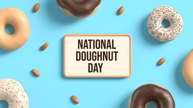 Celebrate National Donut or doughnut day, sweet retreat snack, happiness through dessert party, dairy bakery food for life event