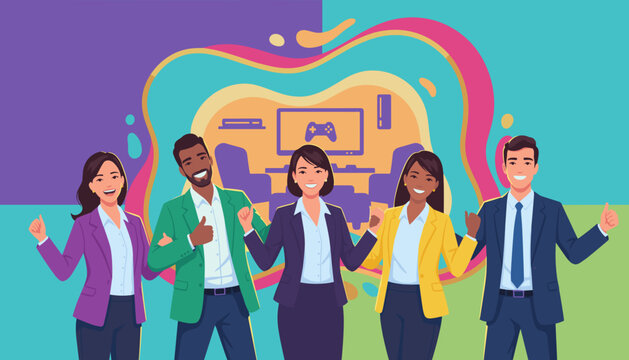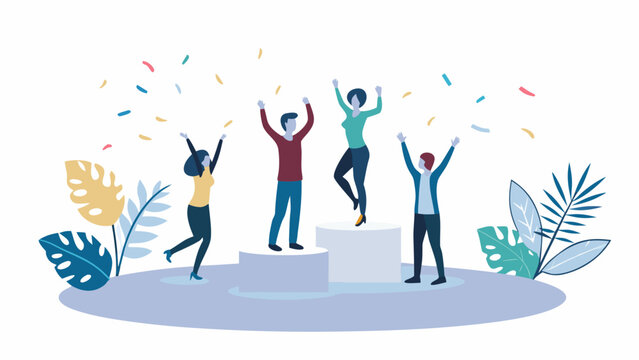 Flat illustration of a multicultural crowd celebrating with raised fists