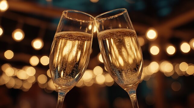 Two champagne glasses clink together in a warm, festive atmosphere, surrounded by soft glowing lights, celebrating a special moment.