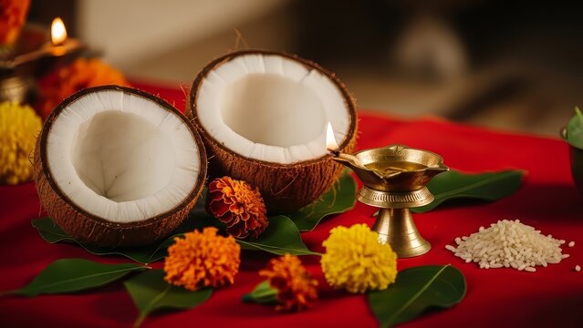 Experience the vibrant traditions of Diwali with coconuts and diyas, celebrating light and prosperity in a stunning cultural display