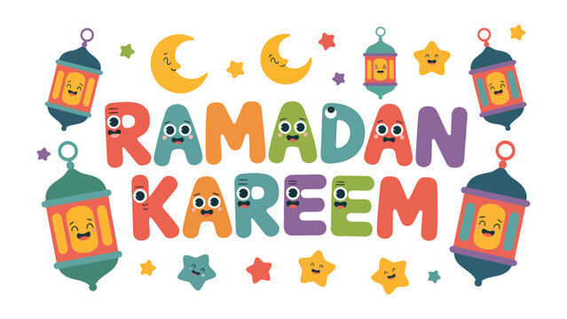 Ramadan Kareem Illustration: Festive and colorful Ramadan Kareem illustration with smiling lanterns, crescent moons, and stars, celebrating the holy month.