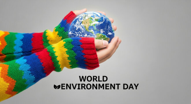 World Environment Day Hands Earth - Hands holding a globe, celebrating World Environment Day. Symbolic image of environmental protection and conservation.