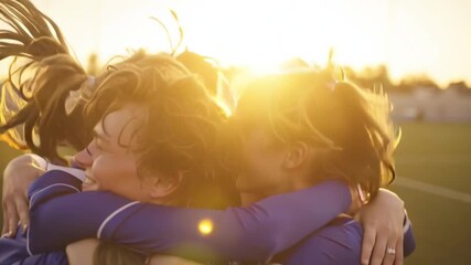 Celebrating victory with jubilant soccer team hugging on soccer field after game. Soccer team enjoys winning match. Passionate soccer team embraces after great win, showing sportsmanship.