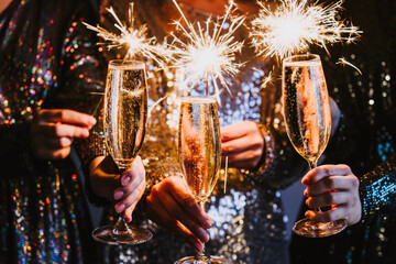 Friends celebrating Christmas or New Year eve party with Bengal lights and champagne.