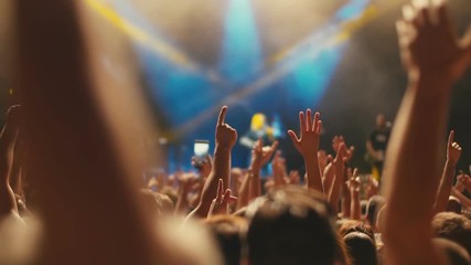 Iconic night rock concert front row crowd cheering hands in air slomo 100p