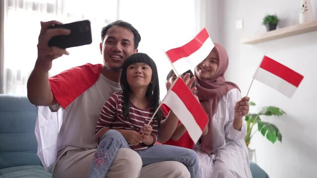 Muslim woman in red and white outfit smiling while holding smartphone and making a victory gesture, celebrating Indonesian Independence Day with joyful energy and digital engagement