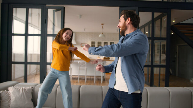 Happy Caucasian dad man father male dancing with little daughter kid smile having fun moving. Positive guy daddy enjoy music singing child girl laughing at home family celebrating moving to new house