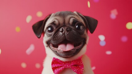 Charming chubby pug puppy celebrating birthday bright red background cute pet photography joyful atmosphere