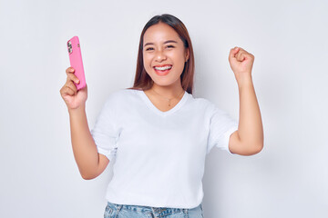 Beautiful excited Asian girl wearing casual white t-shirt holding mobile phone, raising her fist, celebrating good luck isolated on white background. People lifestyle concept