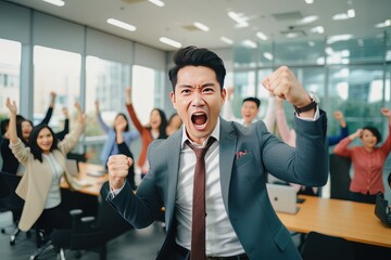 Asian Businessman Showing a Fighting Pose, Male Entrepreneur Gestures Raising Fists in Modern Office, Fights a Problem, Celebrate Success and Achieving Goals.