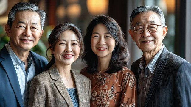 An Asian family business celebrating a milestone, with multiple generations gathered in a welcoming, traditional business setting.