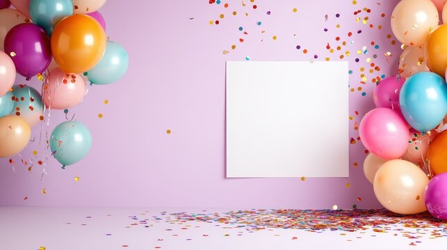 Colorful balloons and confetti floating in a bright blue sky, celebrating joy and festivities.
