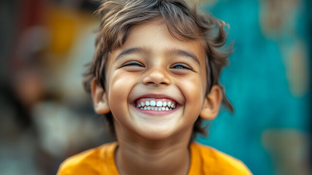 A joyful child celebrates World Smile Day with a big smile in a vibrant outdoor setting