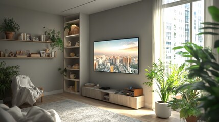 Modern living room with cityscape view on a large TV. Stylish decor, cozy rug, and a touch of greenery create a relaxing atmosphere