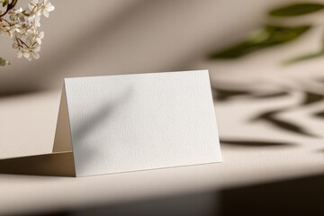 Elegant blank white tent card standing on a reflective surface with shadows and soft blurred background for event place cards and table setting decor