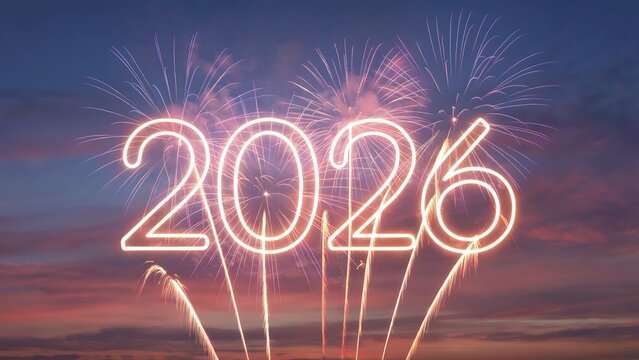 Celebratory image shows 2026 with fireworks. Represents New Year's, event, or greeting. Ideal for marketing, web design, or editorial use.