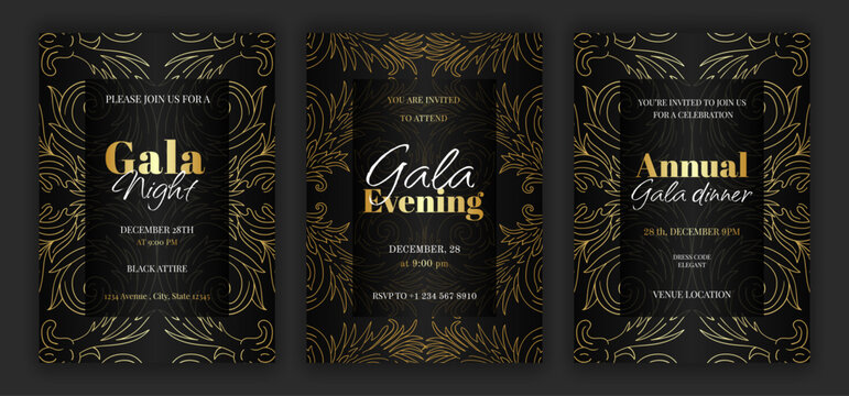 Luxury black annual gala dinner, night, evening invitation template set with golden details and text. Baroque style retro ornate pattern background. EPS 10 vector illustration.