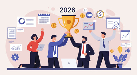 Team celebration with trophy for 2026 success in office setting