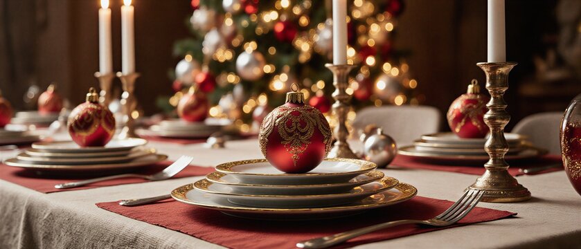 festive table setting with stacked plates ready for a christmas dinner celebration | christmas, holiday, dinner, celebration, festive theme