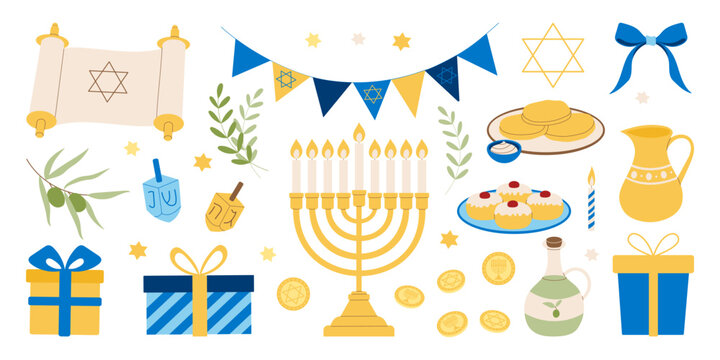 A collection of festive items including a rocket, party hat, candle, and pot on a white background.